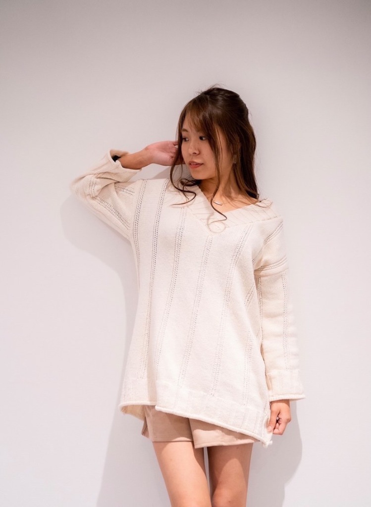 Vネックデザインが鎖骨部分を見せてくれることにより、首より上の部分をすっきりとした印象にしてくれる効果があるんです!