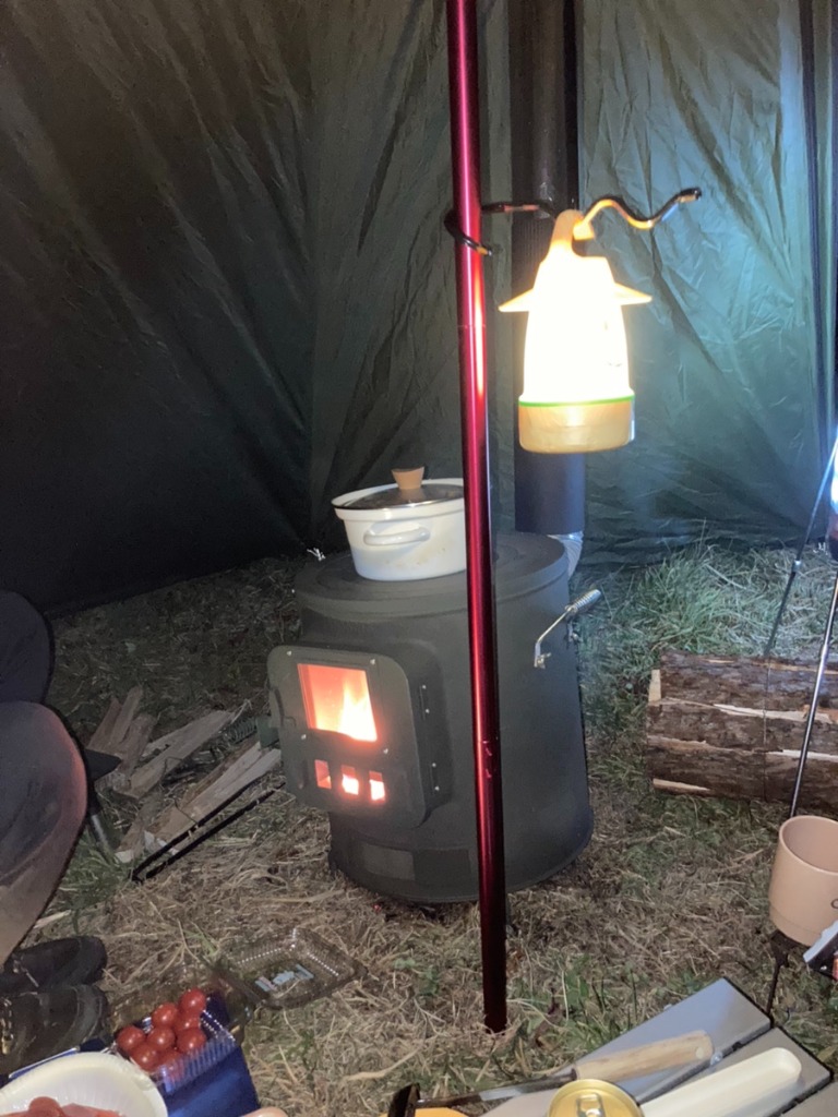 薪ストーブが頑張っているから、テントの中はこたつ状態でいられるんです。