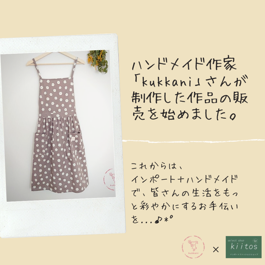早速、“kukkani”さんのオリジナルエプロンをショップにupさせていただきましたが、これがめちゃくちゃ可愛いエプロンなんです♡